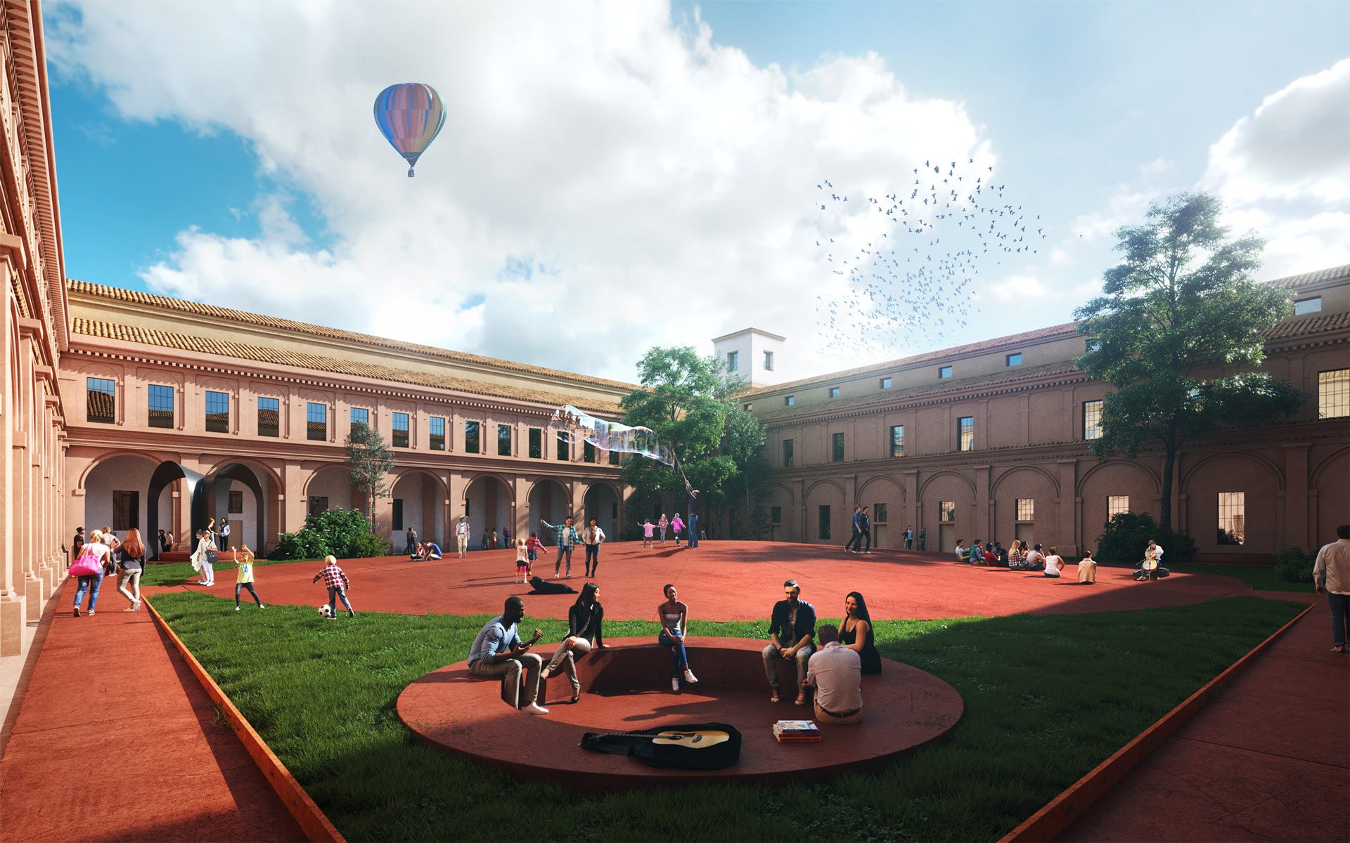 Our project for the conversion of two monasteries, previously used as military barracks, in the city of Piacenza is one of those urban regeneration stories that bring together conservation of historical heritage, real estate strategies and architectural design. Our approach is always to minimise loss of social value and release of embedded CO2 linked to the demolition of existing buildings and to maximise the potential for reuse and recycle of long standing, slowly layered urban fabric. Architectural design becomes the connecting link between, on the one hand, heritage and planning constraints and, on the other hand, the opportunity to match market demand with a new mixed-use programme. Deep understanding of the estate market allowed us to recommend our client a phased programme so that high risk assets can gain value due to economy of location before big Capex works take place. Our masterplan for Piacenza’s barracks start from the creation of thriving hubs for services and active urban lifestyle. This is achieved with low cost temporary uses, ranging from music and street food festivals to farmers markets. As the area gains visibility and desirability the real regeneration scheme can start at a lower risk threshold. Where soldiers used to sleep in long and monotonous rows of bunkbeds there will soon be start-up incubators, co working spaces and student housing. Garages for army vehicles will be converted into bars and restaurants. Renaissance cloisters, once closed off from the city, will be opened up for children to play. The high vaulted ceiling of the monastery’s hall will house a fashion school, music events and art exhibitions. No tree will be felled in the regeneration process.