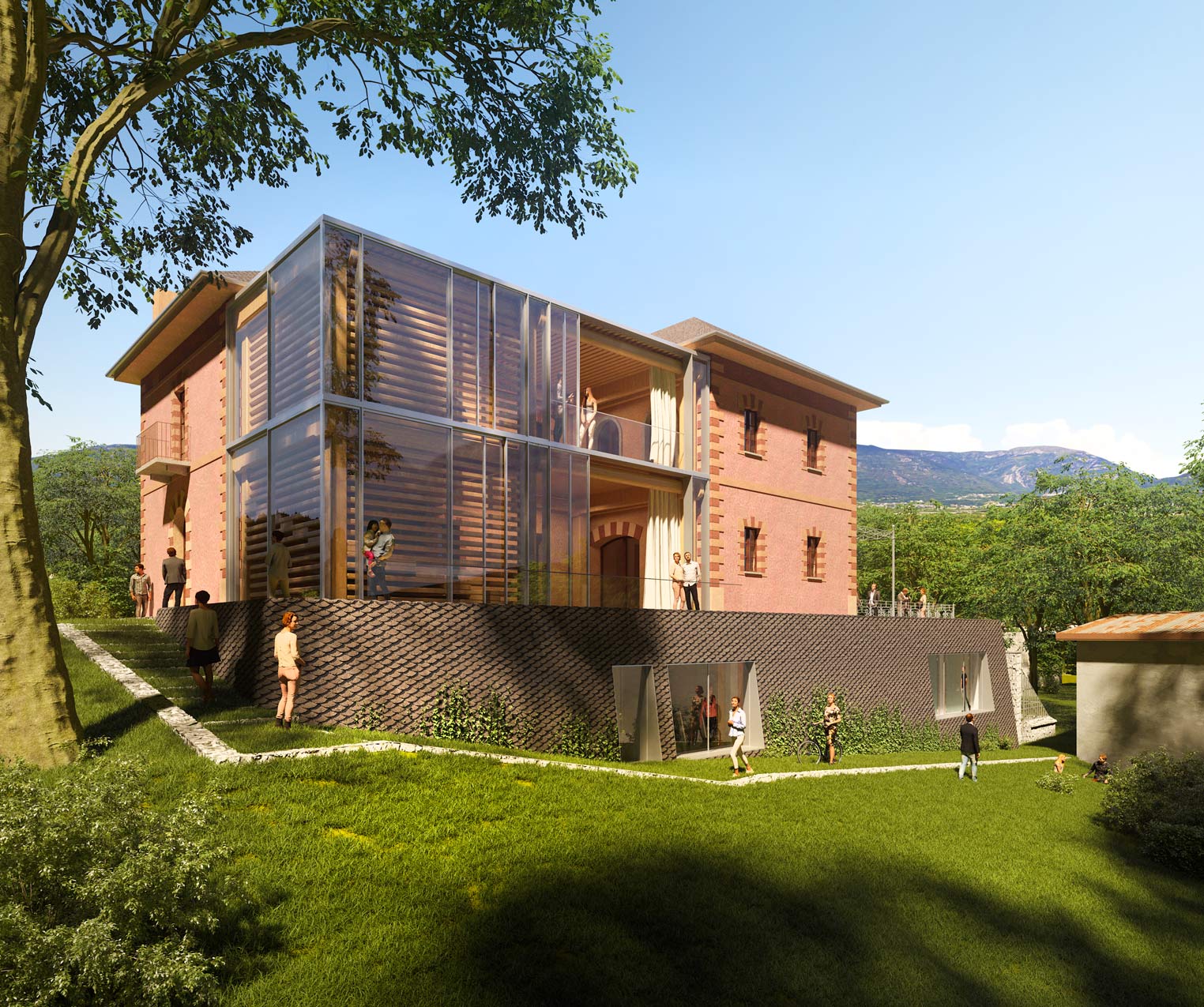 The main villa has been left untouched whilst the available budget has been allocated to restore some of the ancillary buildings. A low carbon refurbishment design will bring a new mix of use along a contemporary, crisply detailed newly designed annex. In order to reposition the area of Masera on the map of premium wine tasting tourism, the plan aims to create a 5 bedroom boutique hotel whilst lowering future CO2 emissions to near zero. A new architectural two storey volume will be inserted alongside the original building. The new wing will be erected using locally sourced FSC certified lumber and will feature a large veranda overlooking the beautiful alpine valleys. Floor to ceiling glazed curtain-wall has been detailed to maximise the experience of the Masera valley. The few exclusive bedrooms have been designed to ensure an exclusive and memorable experience of the ancient wine and new wine house. The Masera Winehouse will be open to all tourists and local community with a rich programme of cultural, music and art events.